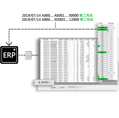 透過SQL資料庫、圖形化操作介面、彈性化之設定作業介面等資訊相關技術,能將ERP的資料整合到本系統上。企業生產所需的核心業務如工單執行、完工報工、生產資訊、設備管理、品資管理等流程整合在一起。將工廠生產線上即時的生產資訊,以APP或 Web的方式準確地傳送給使用者監看。當生產活動發生緊急事件時,還能提供現場緊急狀態的資訊,並以最快速度通知使用者。
