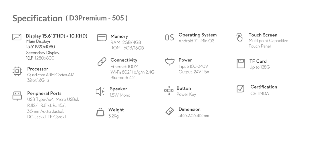 iMin D3,10.1寸台式POS機。 三種單雙屏組合,搭配豐富介面供錢箱與掃碼設備使用,為您的生意提供最合適的選擇。